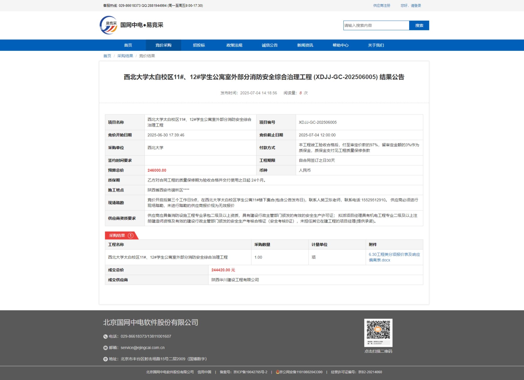 星空app官网太白校区11#、12#学生公寓室外部分消防安全综合治理工程 (XDJJ-GC-202506005) 结果公告 作者: 编辑:采购与招标办公室 时间:2025-07-04 原公告链接:https://www.ejingcai.com.cn/site/bidding/detail/19344