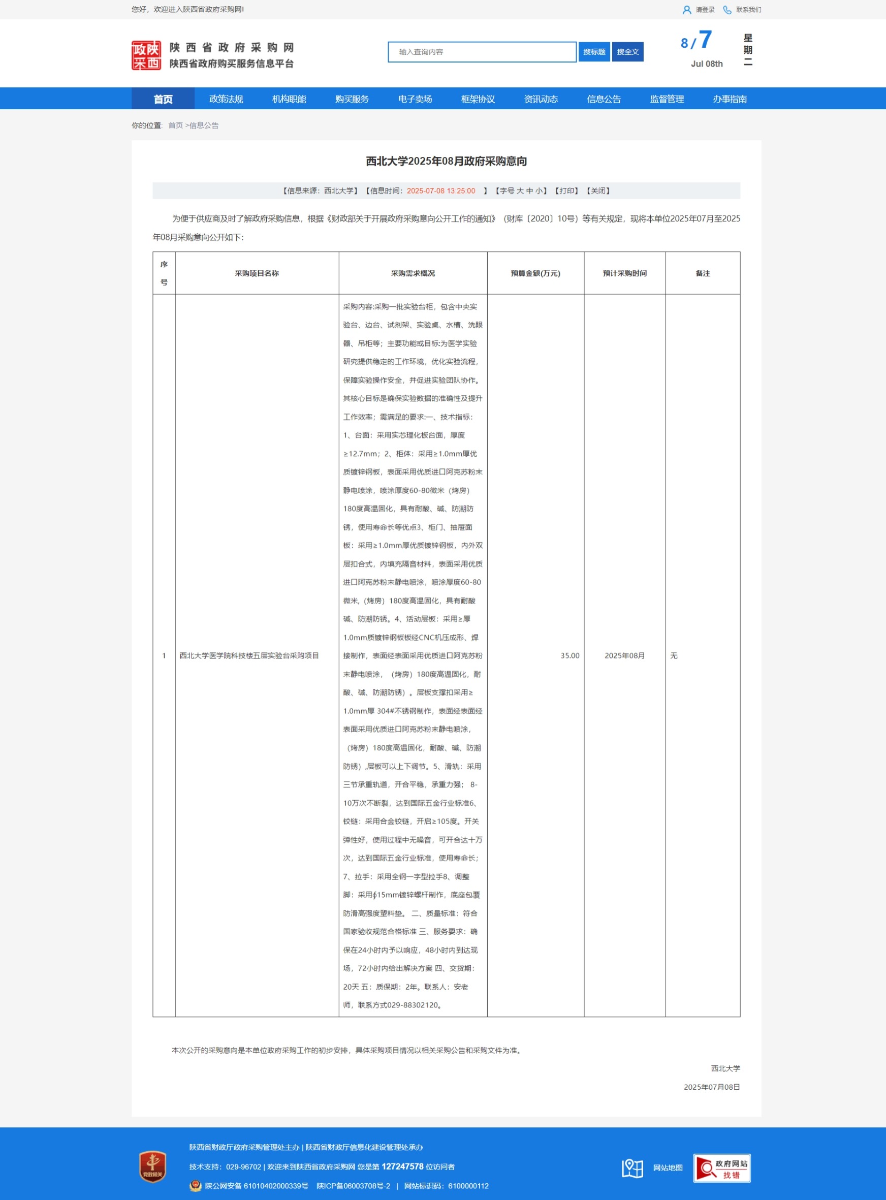 星空app官网2025年08月政府采购意向 作者: 编辑:采购与招标办公室 时间:2025-07-08 原公告链接:https://www.ccgp-shaanxi.gov.cn/freecms/site/shaanxi/ggxx/info/2025/8a69c68d97d2c4550197e87d6842455f.html?noticeType=59¬iceId=e4cb9cdd-5bbd-11f0-8063-08c0eb20c666