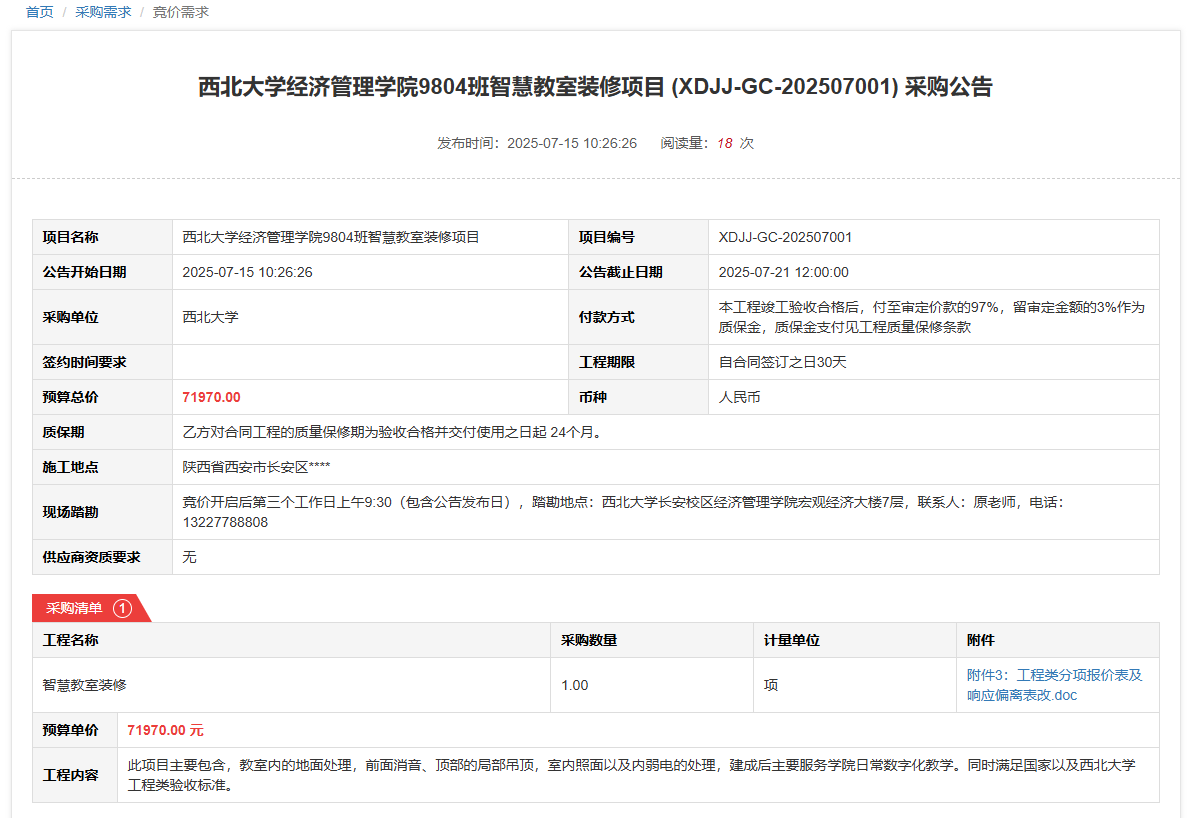 星空app官网经济管理学院9804班智慧教室装修项目(XDJJ-GC-202507001)竞价采购公告