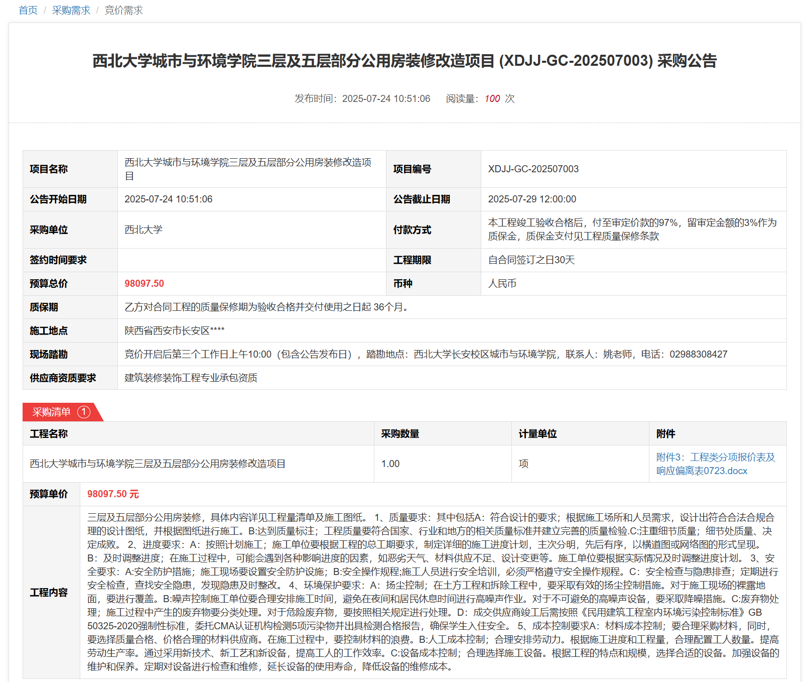 星空app官网城市与环境学院三层及五层部分公用房装修改造项目(XDJJ-GC-202507003)竞价采购公告 作者:采购与招标办公室 编辑: 时间:2025-07-24 原公告链接:https://www.ejingcai.com.cn/site/bidding/detail/19707