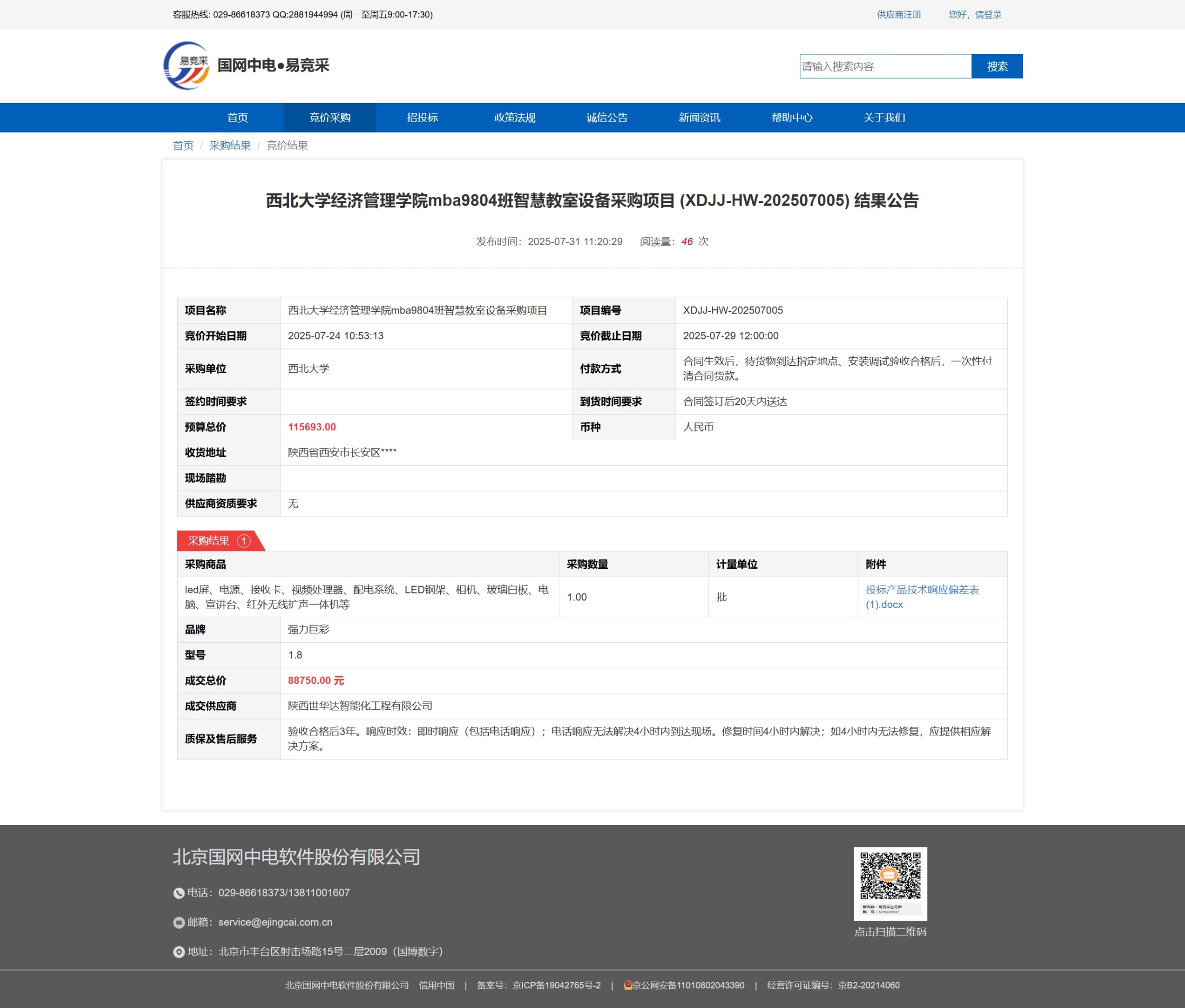 星空app官网经济管理学院mba9804班智慧教室设备采购项目 (XDJJ-HW-202507005) 竞价结果公告 作者: 编辑:采购与招标办公室 时间:2025-07-31 原公告链接:https://www.ejingcai.com.cn/site/bidding/detail/19832