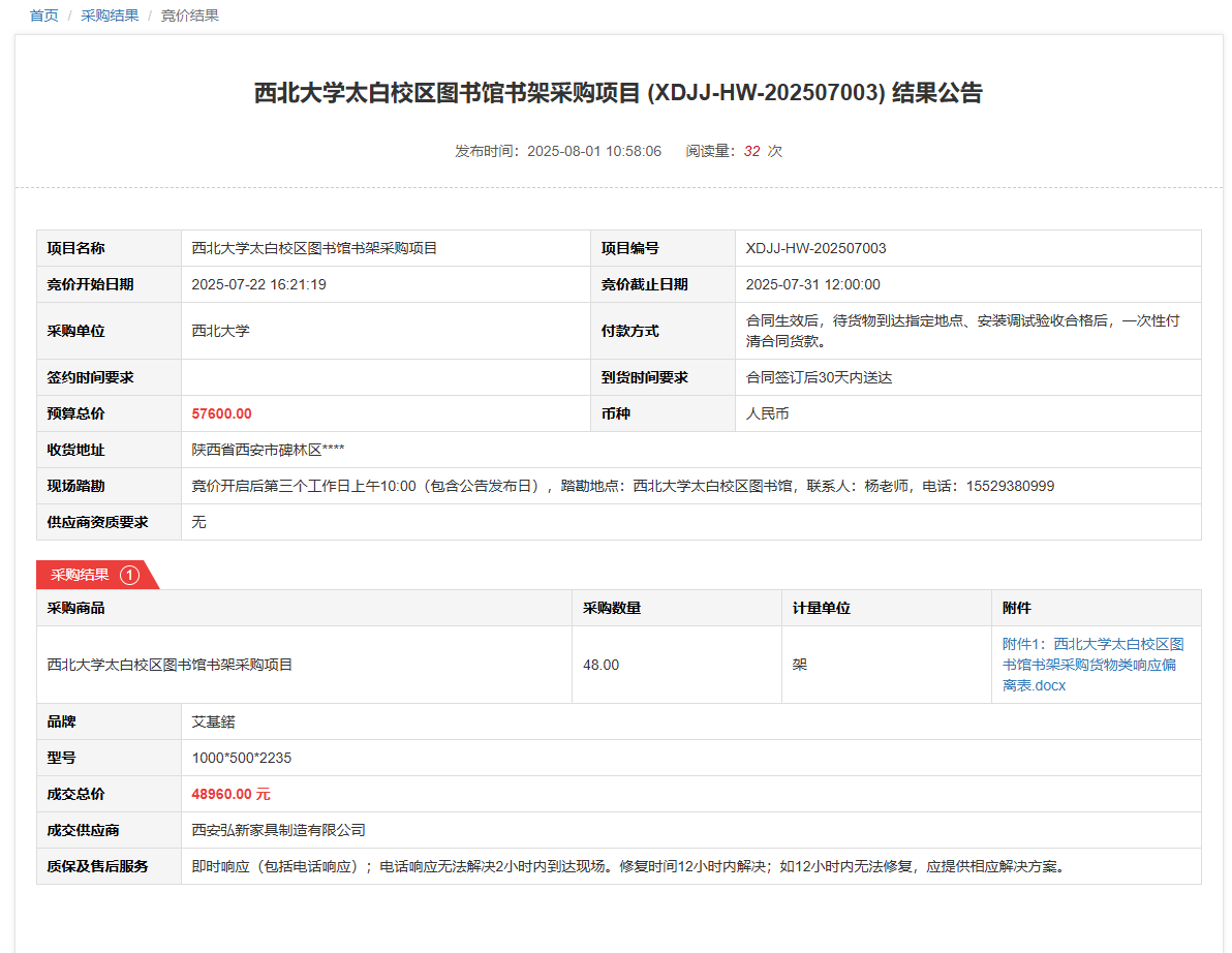 星空app官网太白校区图书馆书架采购项目(XDJJ-HW-202507003)竞价结果公告