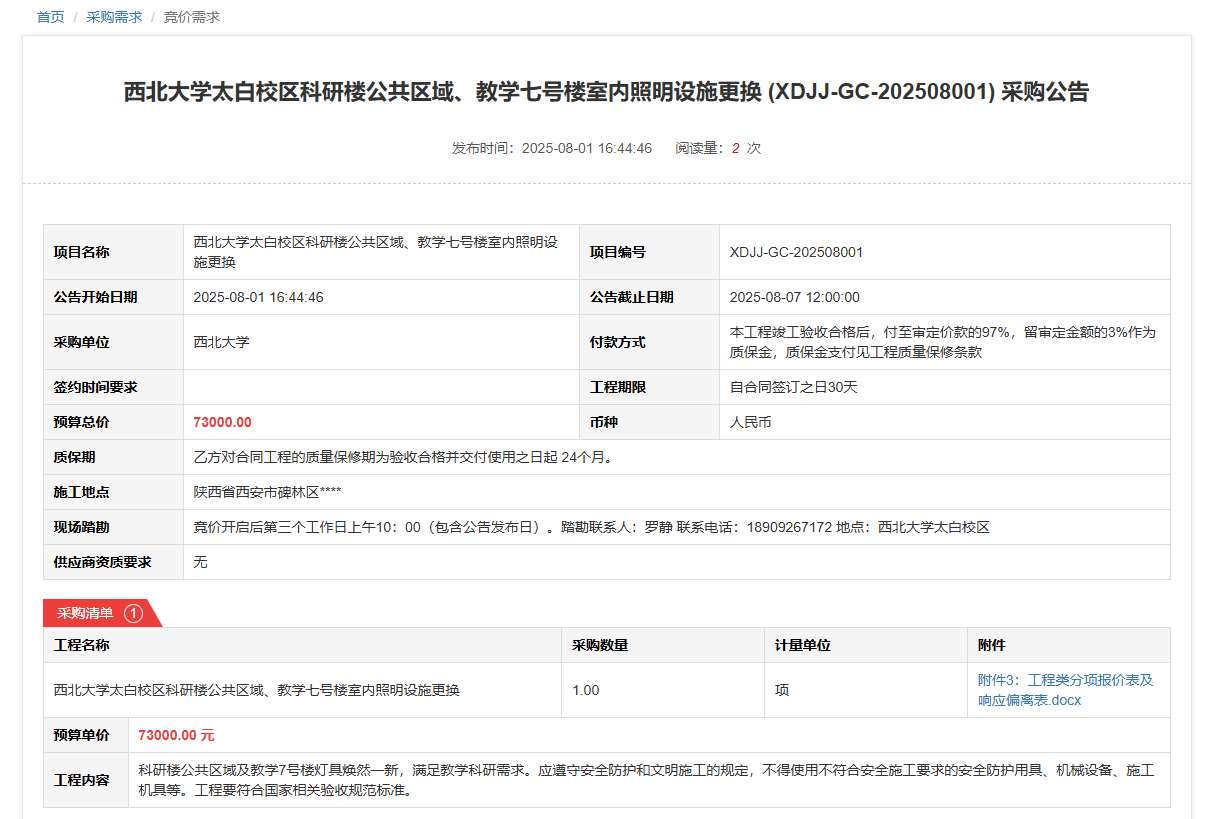 星空app官网太白校区科研楼公共区域、教学七号楼室内照明设施更换(XDJJ-GC-202508001)竞价采购公告