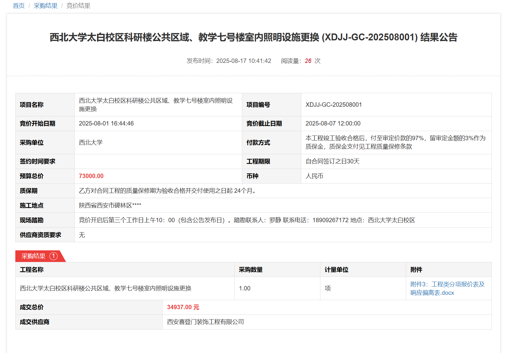 星空app官网太白校区科研楼公共区域、教学七号楼室内照明设施更换(XDJJ-GC-202508001)竞价结果公告