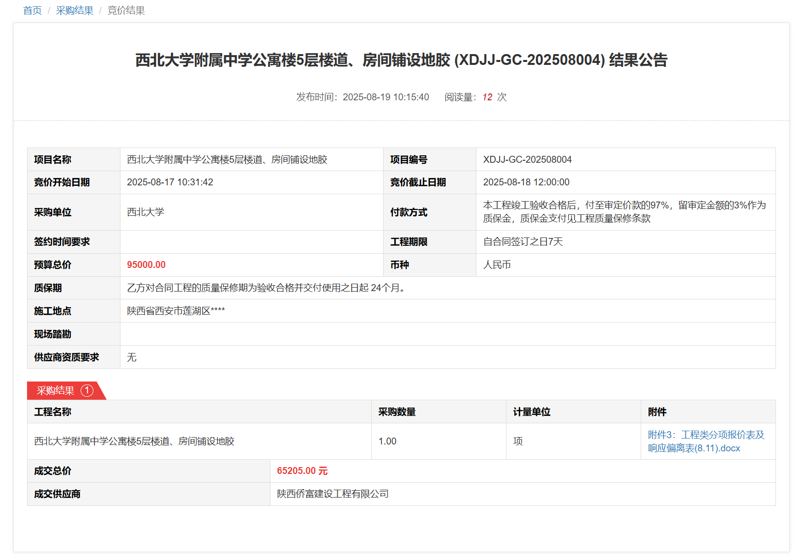 星空app官网附属中学公寓楼5层楼道、房间铺设地胶(XDJJ-GC-202508004)竞价结果公告