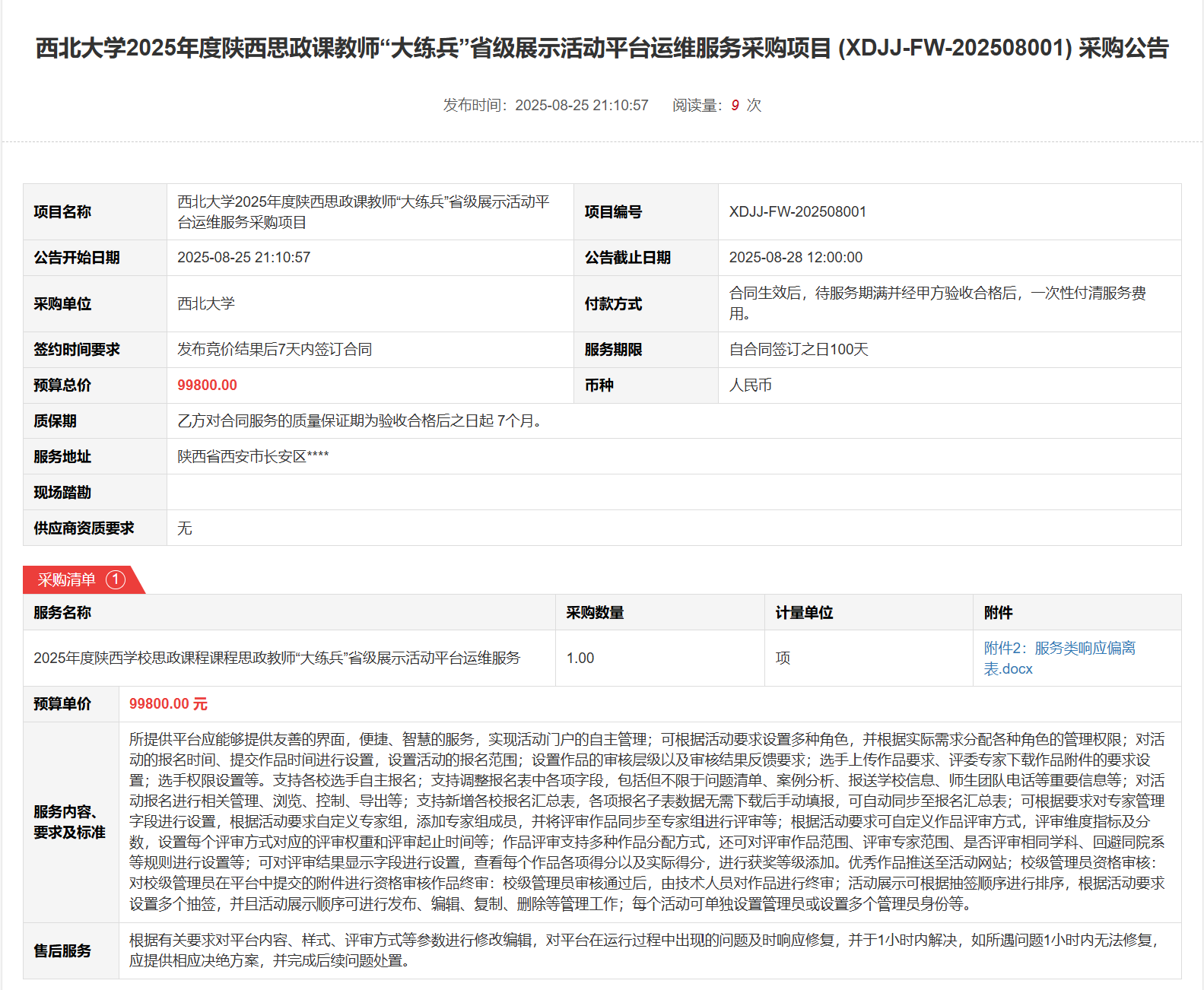 星空app官网2025年度陕西思政课教师“大练兵”省级展示活动平台运维服务采购项目(XDJJ-FW-202508001)竞价采购公告 作者:采购与招标办公室 编辑: 时间:2025-08-25 原公告链接