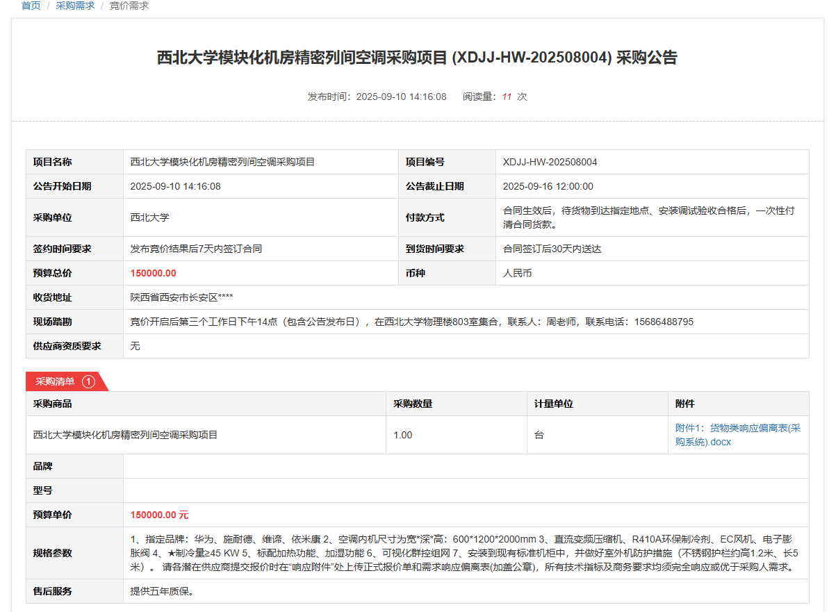 星空app官网模块化机房精密列间空调采购项目(XDJJ-HW-202508004)竞价采购公告
