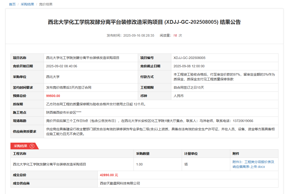 星空app官网化工学院发酵分离平台装修改造采购项目(XDJJ-GC-202508005)竞价结果公告