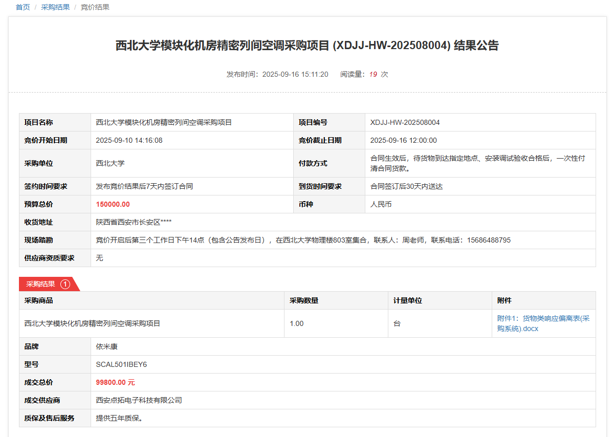 星空app官网模块化机房精密列间空调采购项目(XDJJ-HW-202508004)竞价结果公告