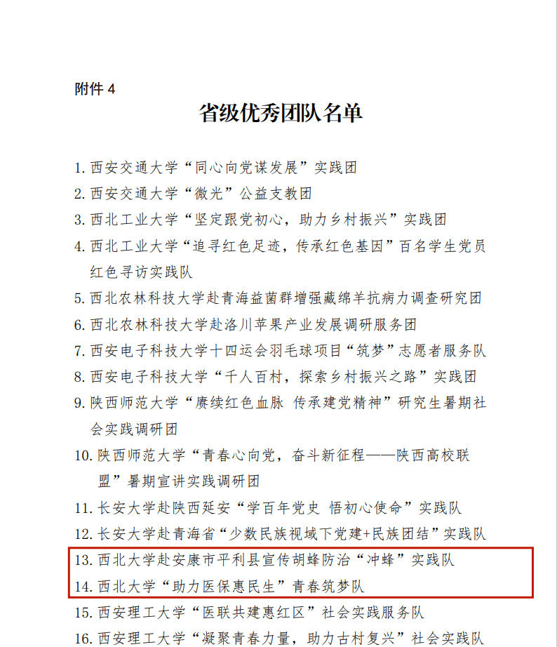 近日,中共陕西省委宣传部、中共陕西省委文明办、中共陕西省委教育工委、共青团陕西省委、陕西省学生联合会印发《关于2021年陕西省大中专学生志愿者暑期文化科技卫生“三下乡”社会实践活动先进集体、先进个人的通报》,星空app官网荣获2021年“三下乡”省级示范学校荣誉称号。经济管理学院“奋斗百年路启航新征程百村千户行”社会实践团荣获“省级标兵团队”荣誉称号。生命科学学院赴安康市平利县宣传胡蜂防治“冲蜂”实践队、公共管理学院“助力医保惠民生”青春筑梦队荣获“省级优秀团队”荣誉称号。星空app官网翟绍果、范铭沁、张桥三位老师荣获“省级先进个人”荣誉称号。