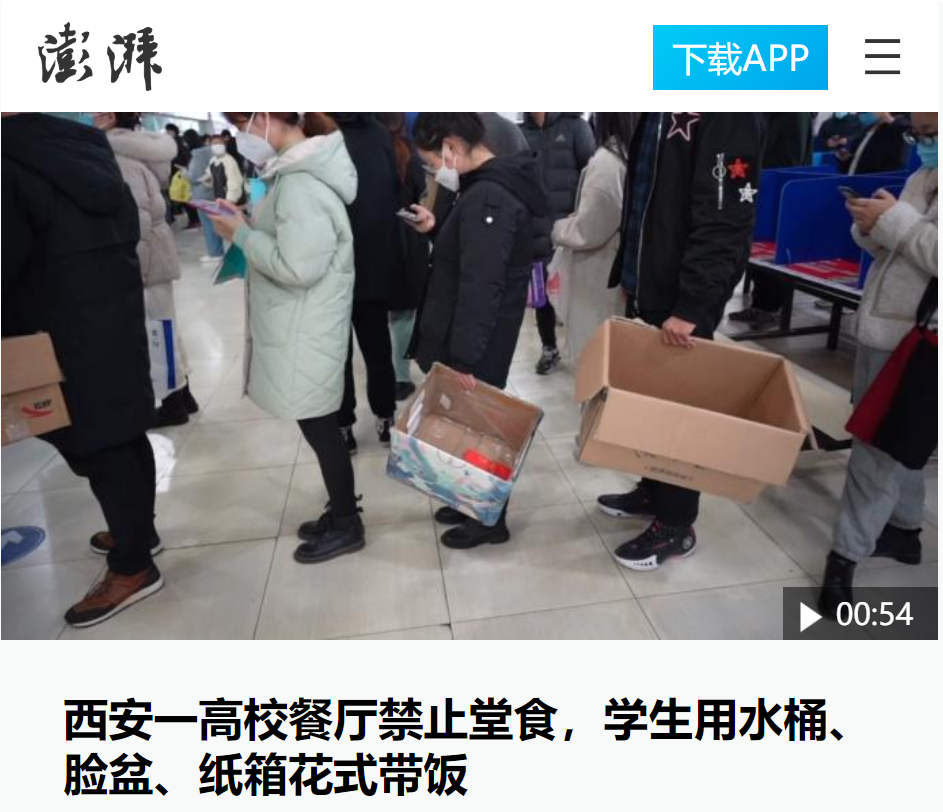 西安一高校餐厅禁止堂食,学生用水桶、脸盆、纸箱花式带饭 作者:王文娟 编辑:张邓斓 时间:2021-12-30 12月28日,陕西西安一高校加强疫情期间校园管理,学校餐厅禁止堂食,由每个宿舍每天指派一人持出入证到餐厅带餐。同学带水桶、脸盆、纸盒等花式带饭。 原文链接:https://m.thepaper.cn/newsDetail_forward_16059712