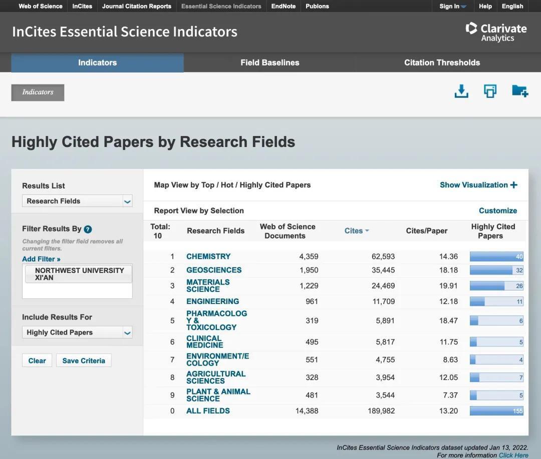 基本科学指标数据库划分22个学科领域,是基于科睿唯安Web of Science所收录的全球12000多种学术期刊的1000多万条文献记录而建立的计量分析数据库,是衡量科学研究绩效、跟踪科学发展趋势、评价国家/地区高校和学术机构国际学术水平及影响力的重要指标工具之一。