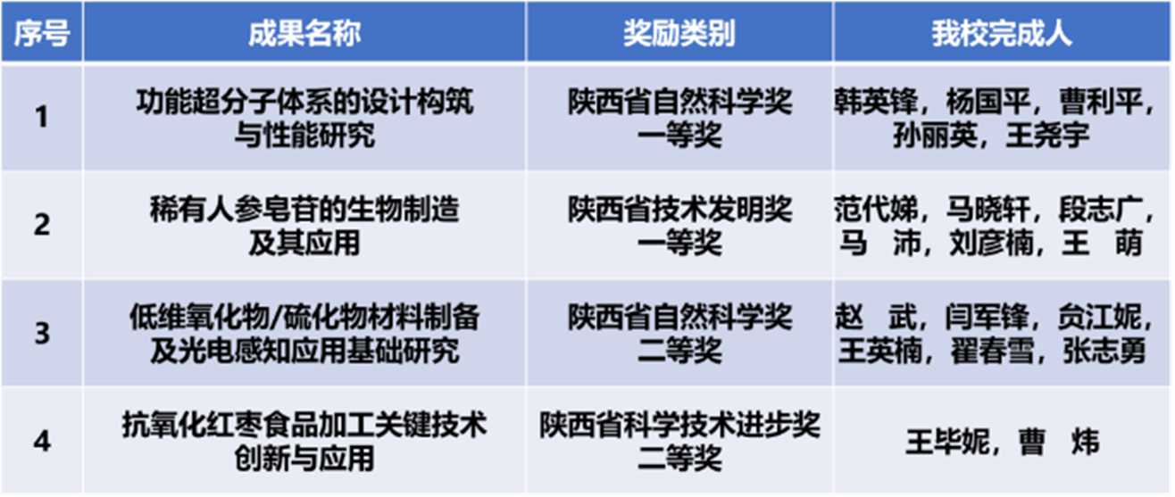 星空app官网化材学院韩英锋教授主持的“功能超分子体系的设计构筑与性能研究”获省自然科学奖一等奖,化工学院范代娣教授主持的“稀有人参皂苷的生物制造及其应用”获省技术发明奖一等奖,信息学院赵武教授主持的“低维氧化物/硫化物材料制备及光电感知应用基础研究”获省自然科学奖二等奖,食品学院王毕妮教授主持的“抗氧化红枣食品加工关键技术创新与应用”获省科技进步奖二等奖。此外,星空app官网参与的“秦岭主要珍稀野生动物抢救饲养繁育关键技术研究”和“陆相页岩油气地质工程一体化的负碳清洁开发技术”分别获得省科技进步奖二等奖。