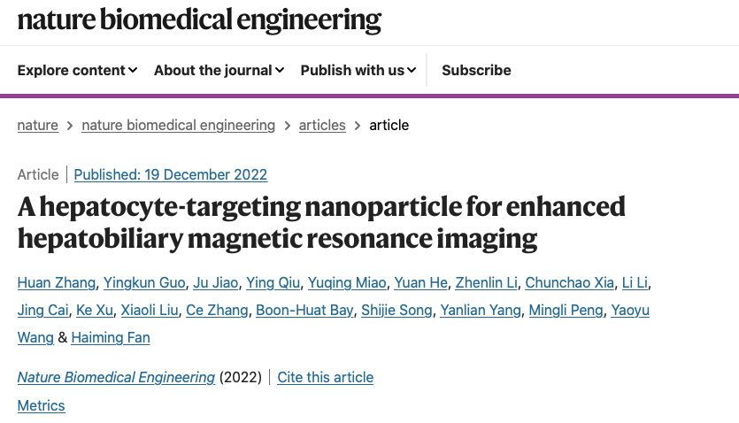相关成果以“A Hepatocyte-targeting Nanoparticle for Enhanced Hepatobiliary Magnetic Resonance Imaging”为题,于2022年12月19日在线发表于Nature Biomedical Engineering(自然生物医学工程)杂志,这是学校首次在该杂志上发表论文。
