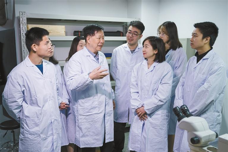 中科院院士舒德干(前左二)和学生们交流(资料照片,本报通讯员马骞摄)。
