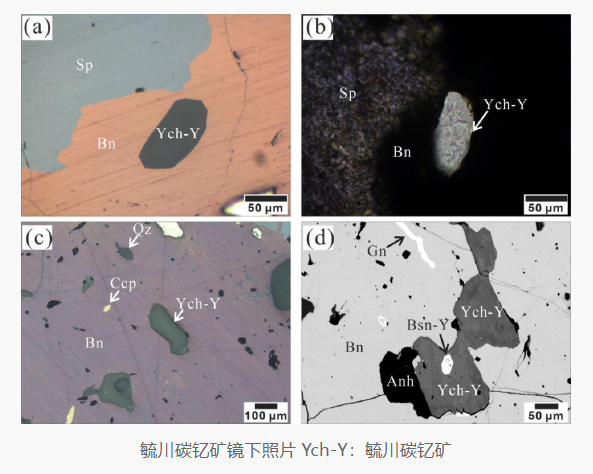 毓川碳矿是一种罕见的含水碳酸盐重稀土矿物,在粤东北玉水铜矿所发现,以我国著名矿床地质与矿产勘查学家,原中国地质调查局局长中国工程院陈毓川院士的名字命名。在显微镜下,毓川碳铭矿呈透明亮灰色,多以30-300um的板状或脉状晶体,与磷矿、氟碳矿、斑铜矿、黄铜矿、闪锌矿、方铅矿、硬石膏等共生。