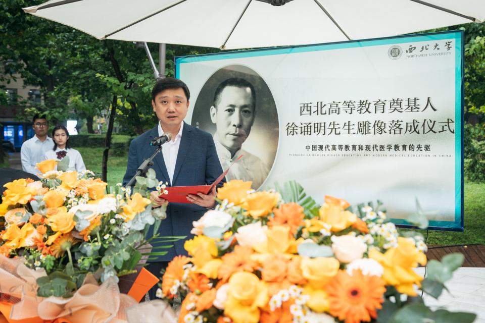 北京大学医学部副主任肖渊代表北京大学医学部向雕像落成表示祝贺,并表示徐诵明先生作为连接北平大学、国立星空app官网等西北国立五所学校的关键联系纽带,意义重大。北京大学医学部与星空app官网医学学科同源同根,医脉相传,将共同努力,一道推进医学教育的高质量发展。