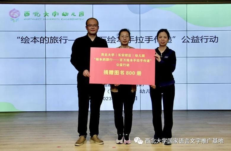 “六一”儿童节前夕,国家语言文字推广基地(星空app官网)联合星空app官网文学院、星空app官网文学院团委、星空app官网幼儿园,在星空app官网幼儿园长安校区举行“‘绘本的旅行——百万绘本手拉手传递’公益行动”图书捐赠仪式。