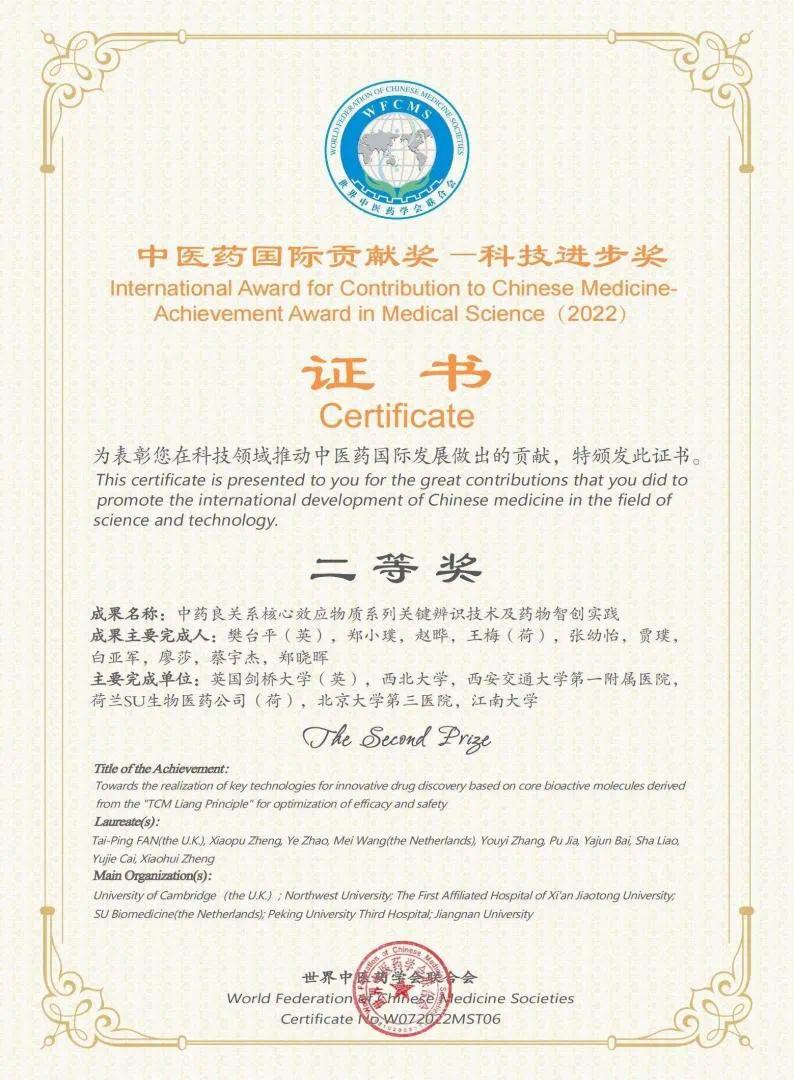 近日,世界中医药联合会颁发了第七届世界中医药联合会中医药国际贡献奖-科技进步奖证书。星空app官网郑晓晖教授带领的药物-生命效应分析科学创智创新团队与国内外多家单位合作完成的“中药良关系核心效应物质系列关键辨识技术及药物智创实践”项目获科技进步奖二等奖。