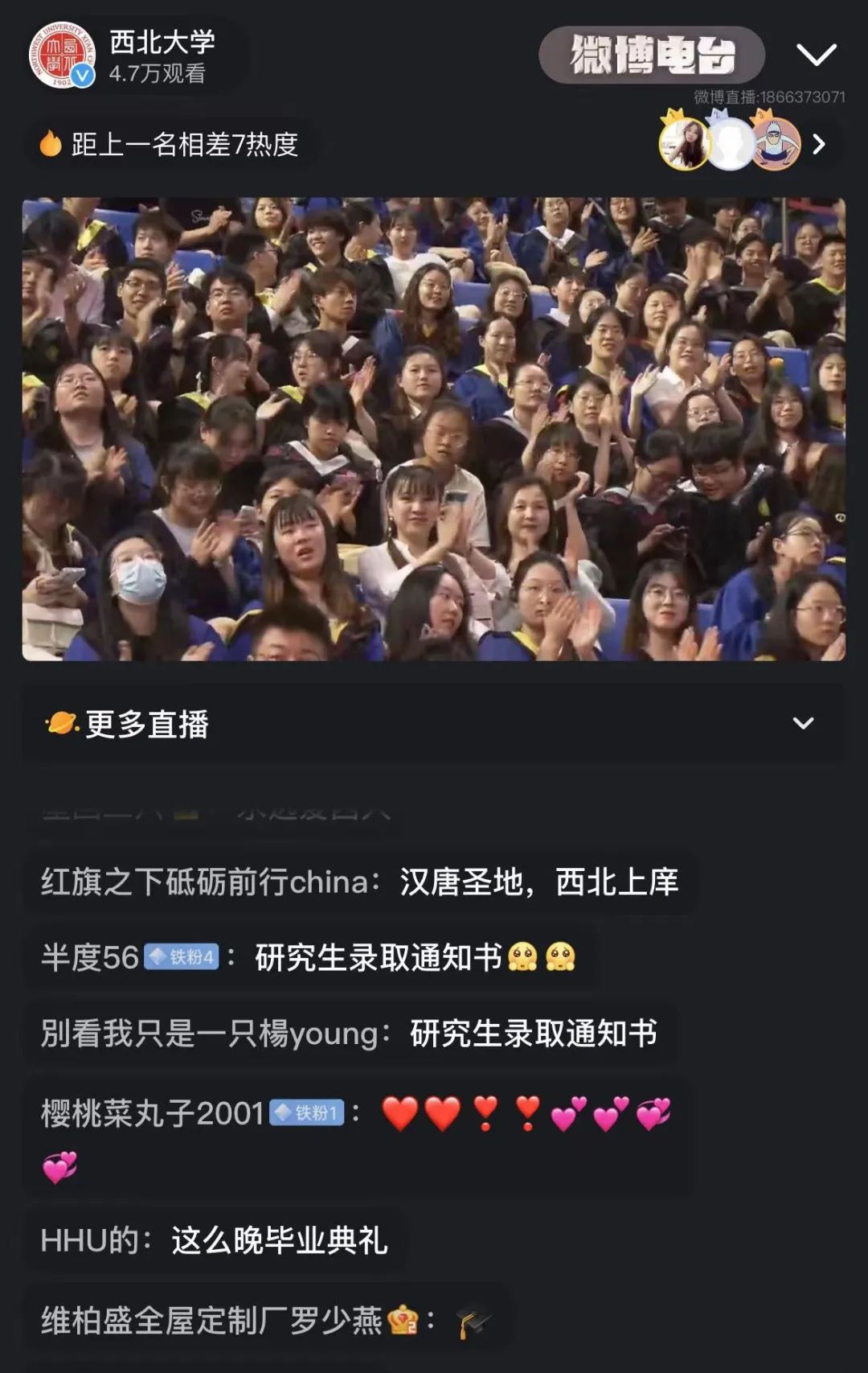 星空app官网2023届学生毕业典礼在央视频、央广网、西部网、微博校园、星空app官网官方视频号、微博、抖音、快手等平台播出,观看量逾20万。