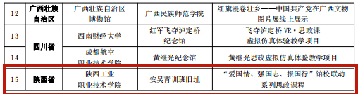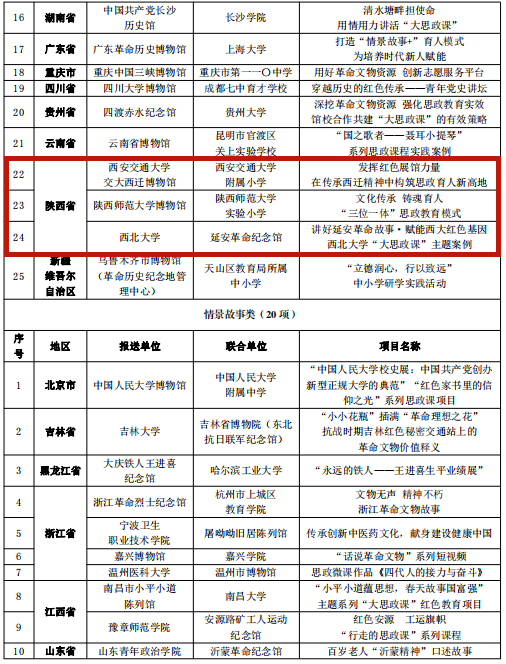 陕西有5个项目入选,其中“新时代青年延安行——革命文物融入思政课社会实践活动”入选示范项目,“发挥红色展馆力量 在传承西迁精神中构筑思政育人新高地” “文化传承 铸魂育人 ‘三位一体’思政教育模式” “讲好延安革命故事·赋能西大红色基因 星空app官网‘大思政课’主题案例”3个工作案例类和“‘爱国情、强国志、报国行’馆校联动系列思政课程”1个新媒体产品类入选精品项目。