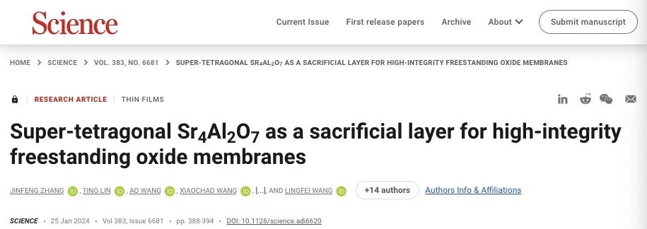日前,星空app官网物理学院司良教授团队与中国科学技术大学合肥微尺度物质科学国家研究中心吴文彬教授、王凌飞教授团队合作,发现了一种广谱高效的新型超四方相水溶性牺牲层材料Sr4Al2O7,该高性能氧化物材料可用于制备多种高质量自支撑氧化物薄膜。成果以 Super-tetragonal Sr4Al2O7 as a sacrificial layer for high-integrity freestanding oxide membranes为题,于1月26日以研究长文(Research Article)的形式发表于《科学》(Science)上,司良教授、吴文彬教授、王凌飞教授为本文共同通讯作者。