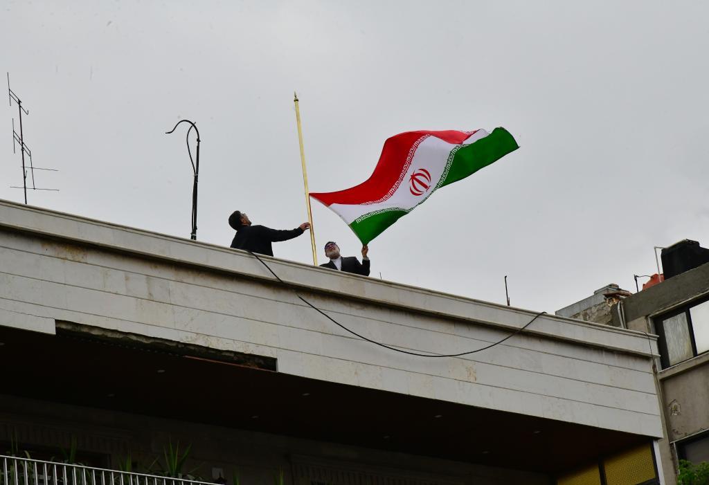 4月8日,在叙利亚首都大马士革,伊朗驻叙利亚使馆领事部门新址升起伊朗国旗。新华社发(阿玛尔 摄)