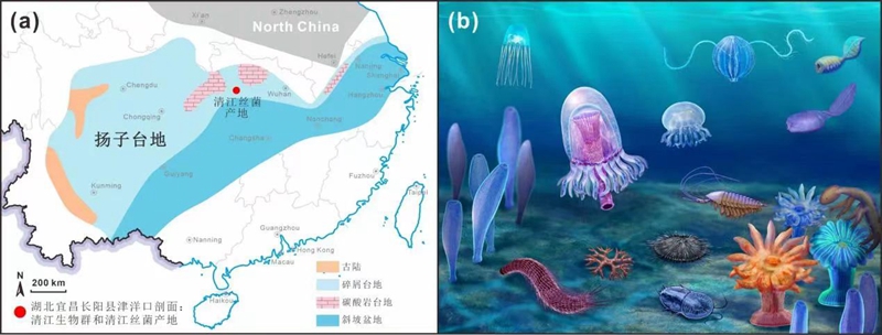 清江丝菌化石的产地和环境背景。(a)早寒武纪扬子台地岩相古地理图和清江丝菌及所属清江生物群的化石产地;(b)清江生物群生态复原图 星空app官网供图