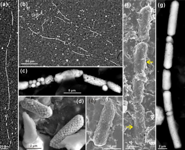 研究团队根据化石证据和谱系基因组学分析结果,提出硫酸盐还原菌与地球氧化事件协同演化假说,认为脱硫细菌门首先在24亿年前的大氧化事件期间发生辐射演化,约8.5亿年前演化出丝状多细胞种类;在新元古代末期,地球第二次氧化事件导致海底广泛氧化,丝状种类约在5.6亿年前获得传导电子功能,硫酸盐还原通路逆转,演化成可以跨越氧化还原界面,一端在还原带氧化硫,另一端在氧化带还原氧的电缆细菌。