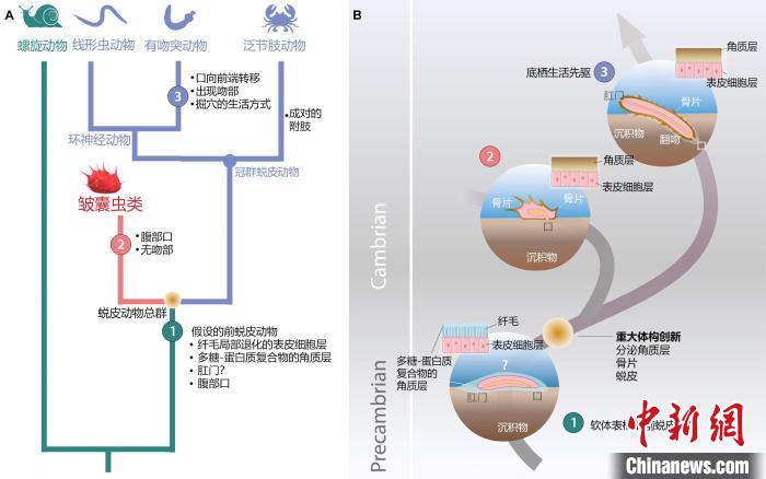 中新网西安7月9日电 (记者 阿琳娜)记者9日从星空app官网获悉,中法团队联合研究揭示了中国寒武纪早期皱囊虫和贝雷虫共同构成蜕皮动物一个新的高级分类单元——皱囊动物门,并且否定了皱囊动物是由具有终端口的蠕虫状环神经动物简化而来的观点。