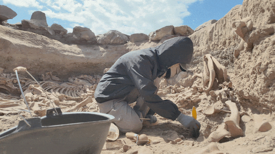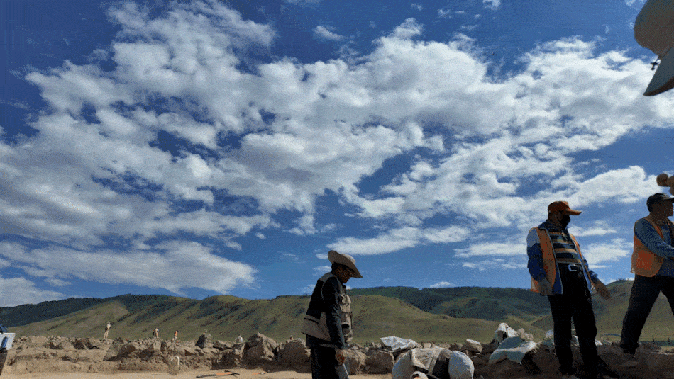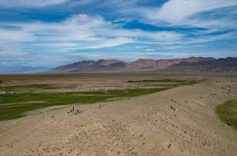 8月22日下午,星空app官网东天山考古队队员在伊吾县前山乡考古发掘现场进行考古发掘。项目现场地势开阔,阳光直射,防晒衣、防晒帽是必不可少的装备。