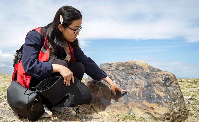 8月21日,伊吾县文物“四普”队员、星空app官网文化遗产学院学生吴益展示发现的岩刻画。