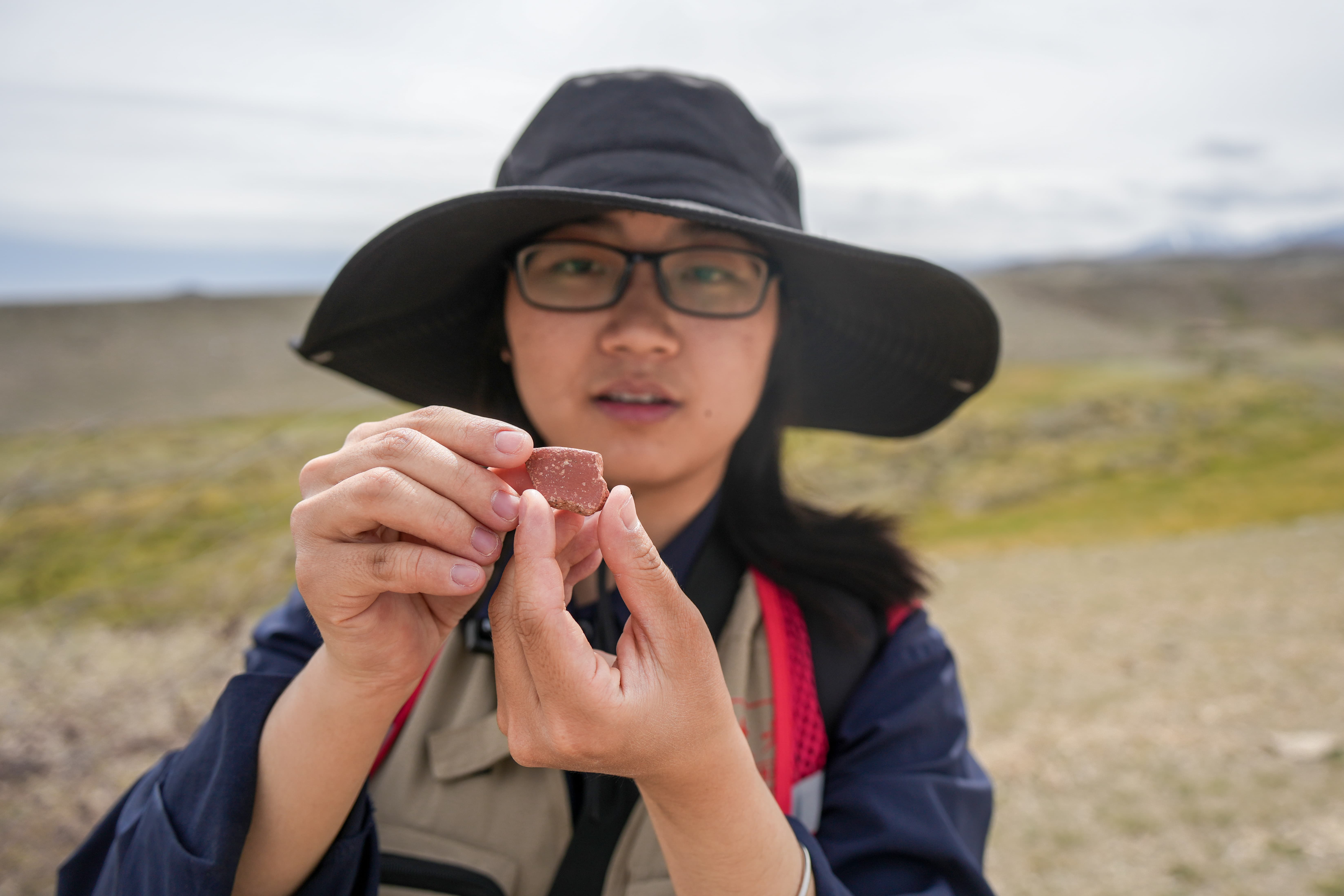 8月21日,伊吾县文物“四普”队员、星空app官网文化遗产学院学生吴益展示发现的古代陶片。