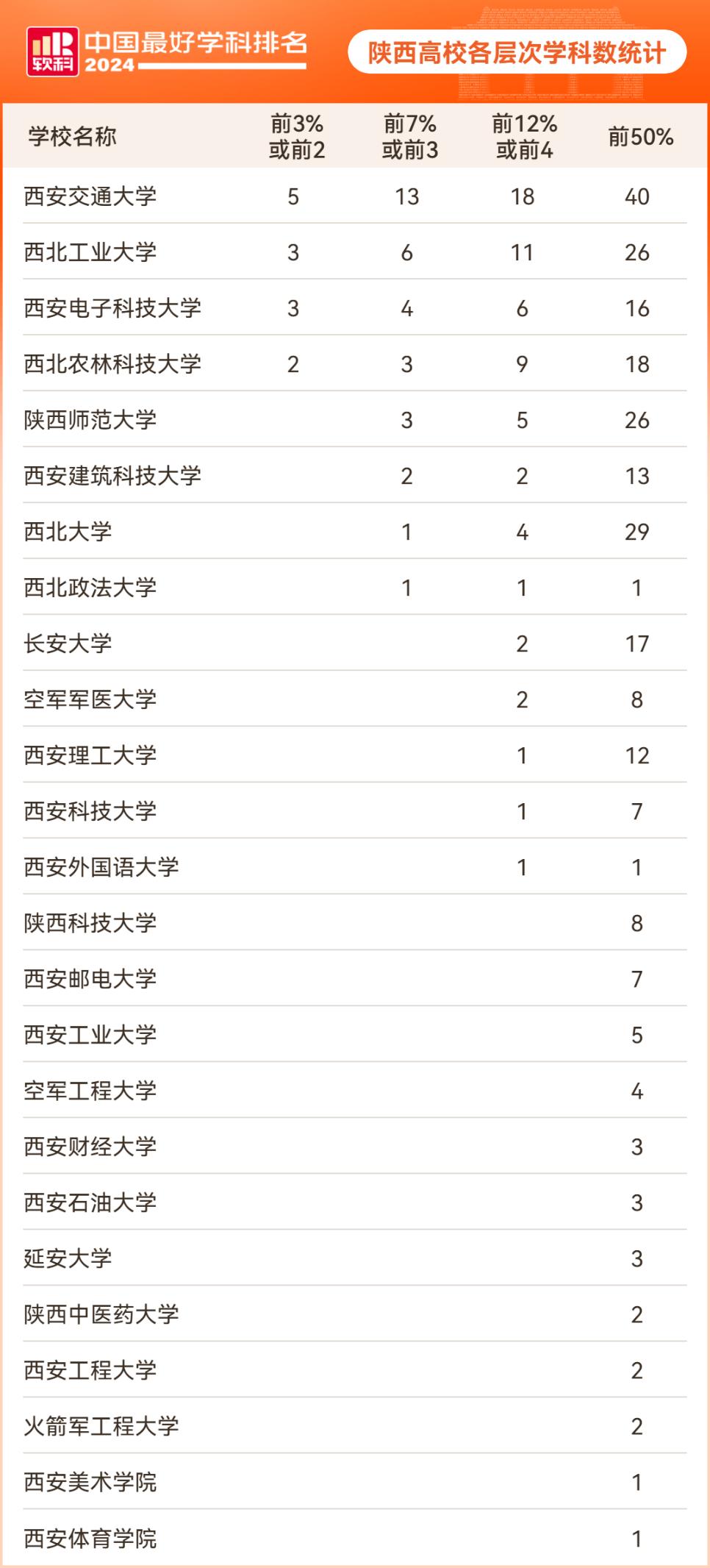 从陕西各高校上榜学科数来看,西安交通大学上榜学科数达40个,领跑全省;星空app官网有29个学科上榜,上榜学科数位居省内第二;西北工业大学和陕西师范大学,均有26个学科上榜。上榜学科数超过10个的陕西高校还有西北农林科技大学(18个)、长安大学(17个)、西安电子科技大学(16个)、西安建筑科技大学(13个)、西安理工大学(12个)。