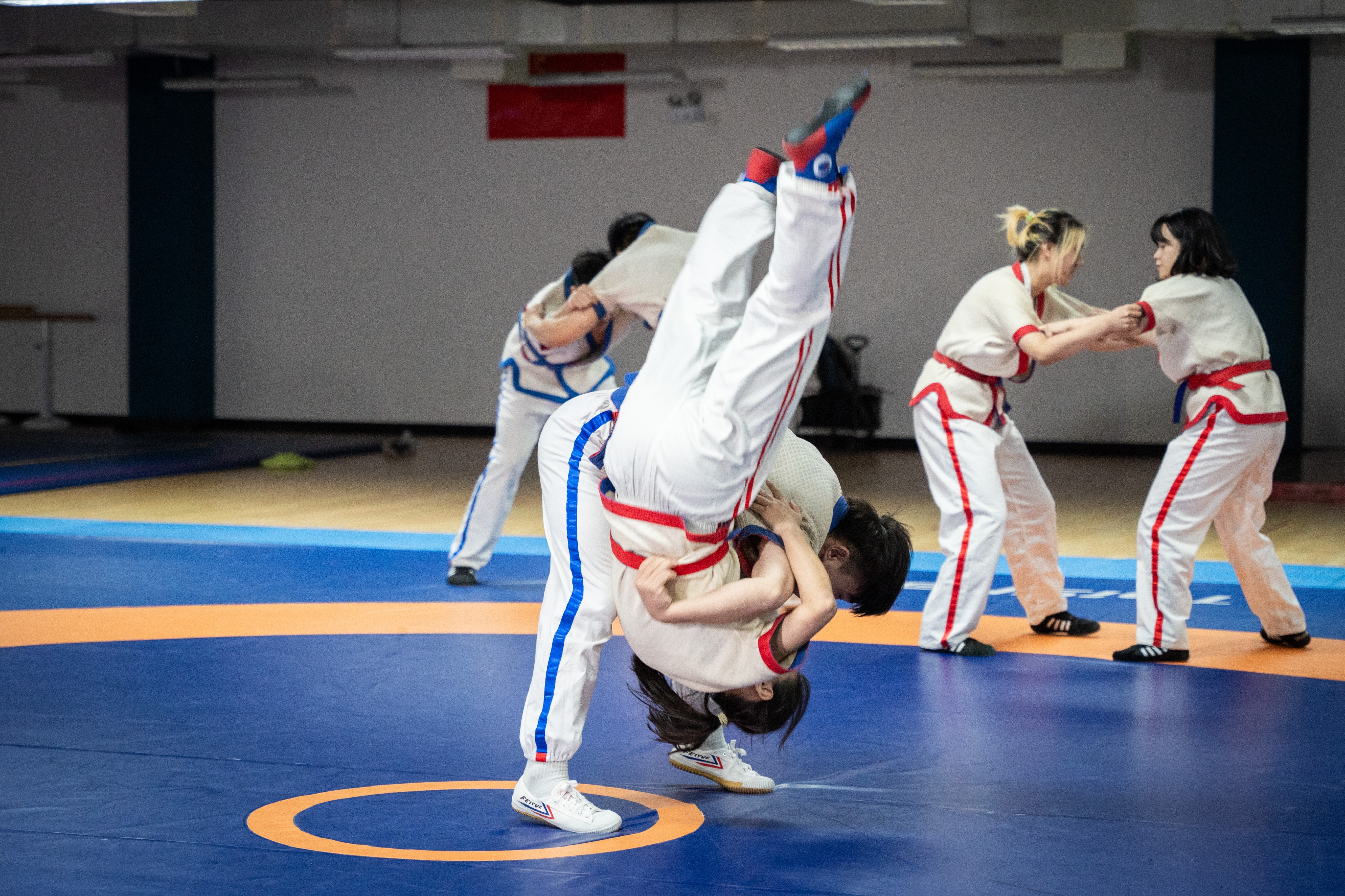 在日常训练中,队长谢宪锋会带大家热身训练,随后开始慢跑、静态拉伸、前后滚翻等专项训练,之后进入摔跤动作要领的熟练度练习和“摔假人”模拟练习,最后进行实战互摔。在老师的指导下,能够保证每位同学习得技巧与方法,在安全不受伤害的前提下完成规定摔跤动作。