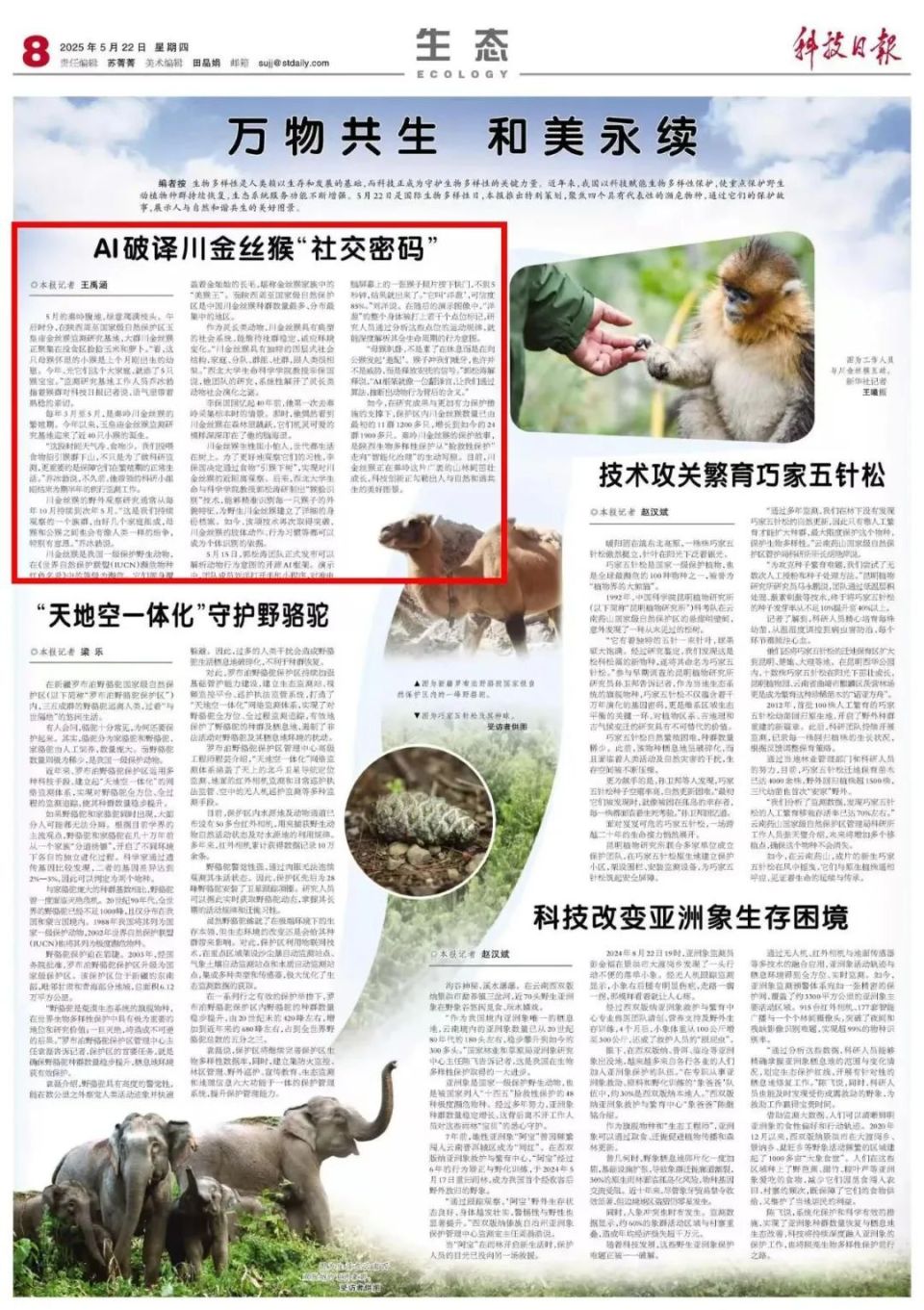当框架能够精准捕捉动物们的“日常节奏”,为每一个动物个体建立行为档案,不仅为此后的科研建立数据库,也为普通人了解动物的内心世界提供了一个窗口。演示中,团队成员、硕士生王詹打开手机小程序,对准电脑屏幕上的一张猴子照片按下快门,不到5秒钟,结果就出来了。“它叫‘洋葱’,可信度85%。”刘洋说。随后的演示图像中,“洋葱”的整个身体被打上若干个点位标记,分析这些点位的运动规律,就能深度解析其全生命周期的行为意图。