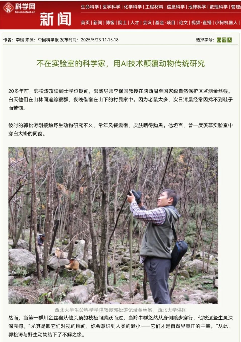 2018年,郭松涛联合星空app官网信息科学与技术学院,和西安电子科技大学跨学科攻关,开始研发专注于动物行为研究的人工智能技术;2020年,团队基于长期积累的金丝猴特征数据,创新性提出具有关注机制的深度神经网络模型,成功研发出全球首个金丝猴个体识别系统(Tri-AI)。