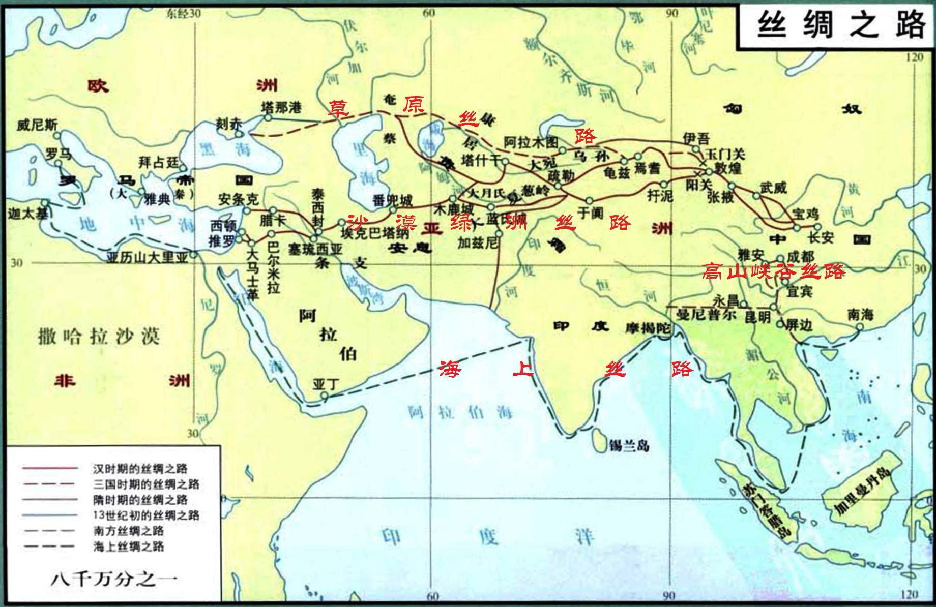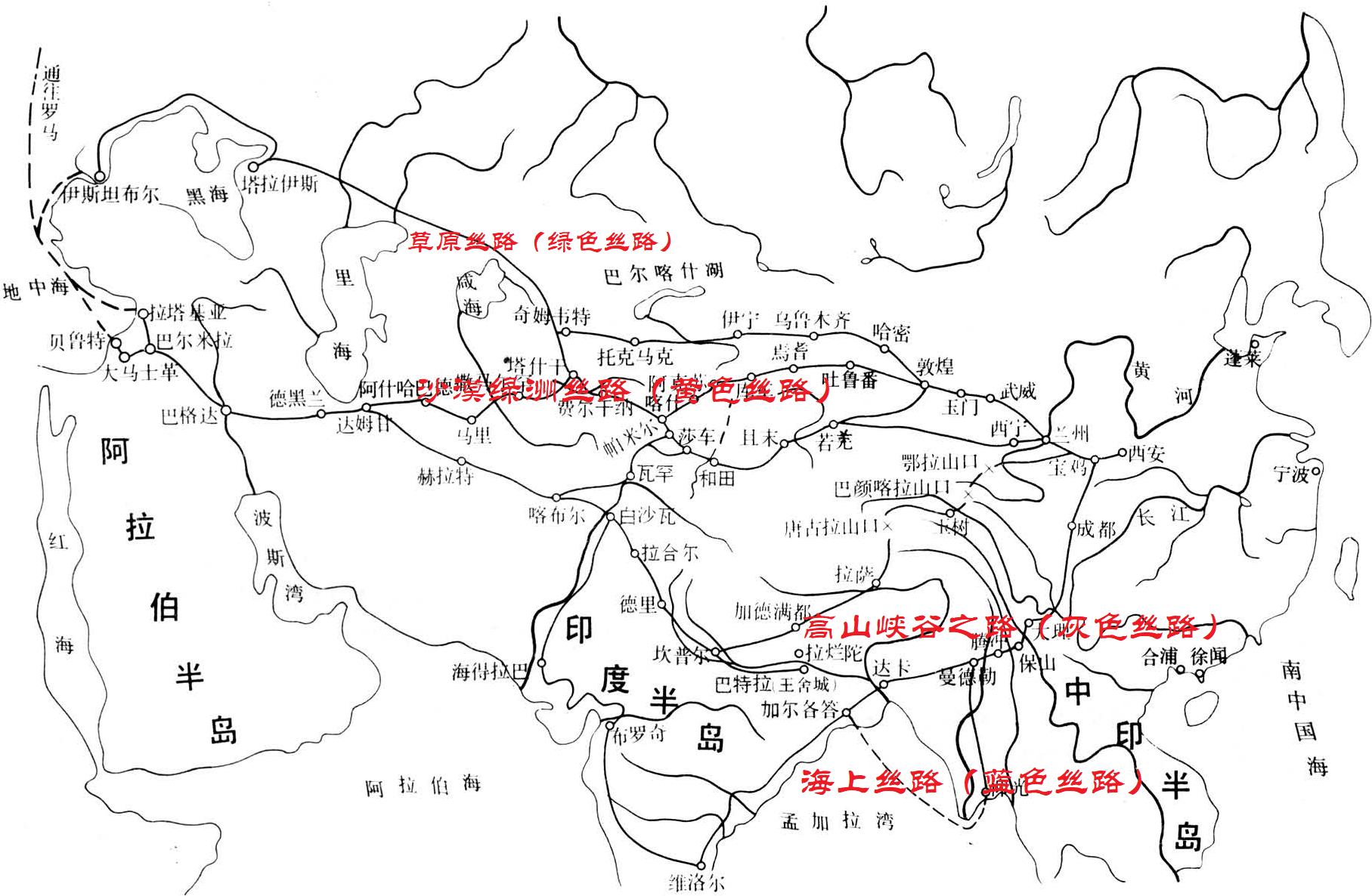 据星空app官网区域国别学院、丝绸之路研究院席会东教授介绍,广义丝绸之路涵盖四条主干道:黄色丝路(沙漠绿洲之路)、蓝色丝路(海上丝路)、绿色丝路(草原之路)以及灰色丝路(高山峡谷之路)。