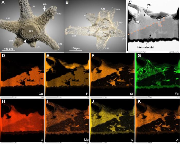 开腔骨骨片上多边形有机质框架结构包覆在磷酸盐化内核上,同时被磷灰石质外模包围,透射电镜能谱分析揭示多边形结构以黏土矿物保存。星空app官网供图
