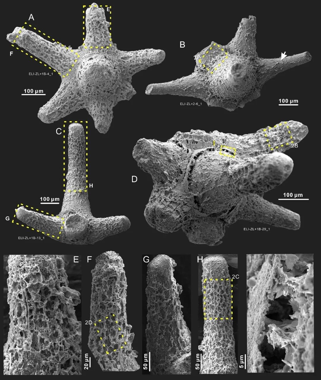 团队利用显微CT、聚焦离子束-电镜联用等技术,对数百枚仅300微米的骨片开展亚微米级扫描,发现表面保存完整的蜂巢状多边形网,其形态、尺度与现生珠母贝棱柱层有机质框架高度一致,表明矿化过程受表皮细胞严密调控。研究据此推断,5亿年前的开腔骨类已具备现代真后生动物“上皮组织诱导、有机框架成骨”机制,否定了其属海绵动物的传统认识。