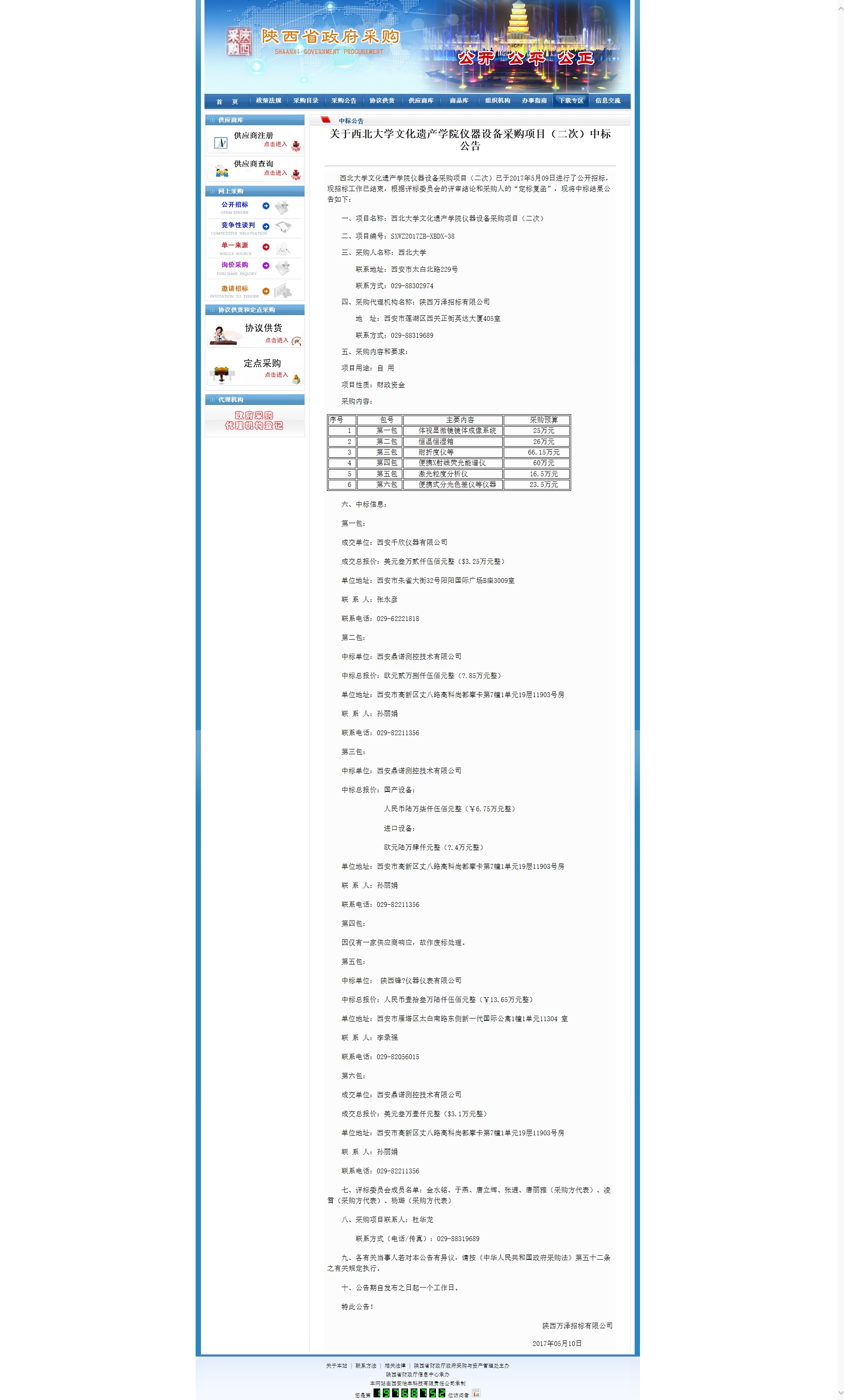 关于星空app官网文化遗产学院仪器设备采购项目(二次)中标公告 作者: 编辑: 时间:2017-05-11 09:03 http://www.ccgp-shaanxi.gov.cn/zbxxs.jsp?NewsID=ZH170510141437US101028111214&ClassBID=C0002