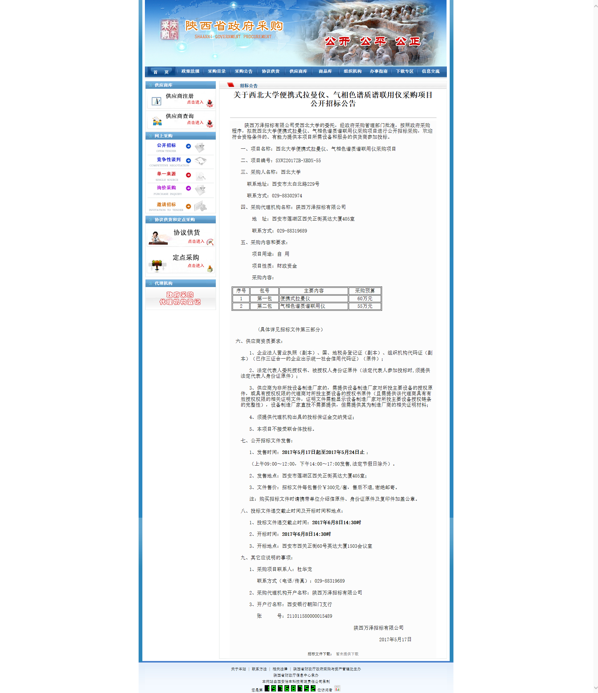 关于星空app官网便携式拉曼仪、气相色谱质谱联用仪采购项目公开招标公告 作者: 编辑: 时间:2017-05-17 16:50 http://www.ccgp-shaanxi.gov.cn/zbxxs.jsp?NewsID=ZB170517133435US101028111214&ClassBID=C0001
