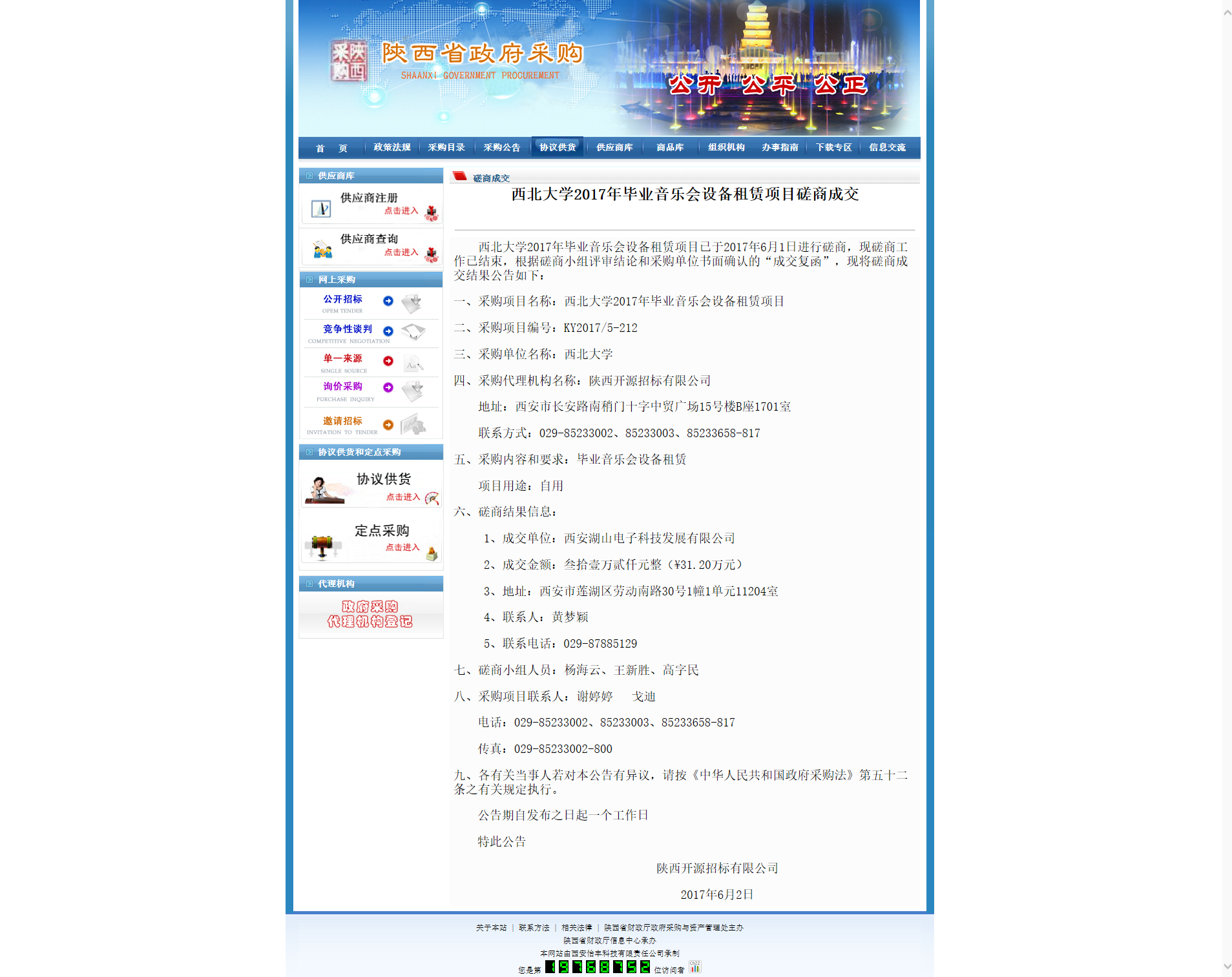 星空app官网2017年毕业音乐会设备租赁项目磋商成交 作者: 编辑: 时间:2017-06-05 09:53 http://www.ccgp-shaanxi.gov.cn/zb_view.jsp?NewsID=ZH170602144541US131018031658&ClassBID=CS002