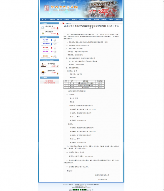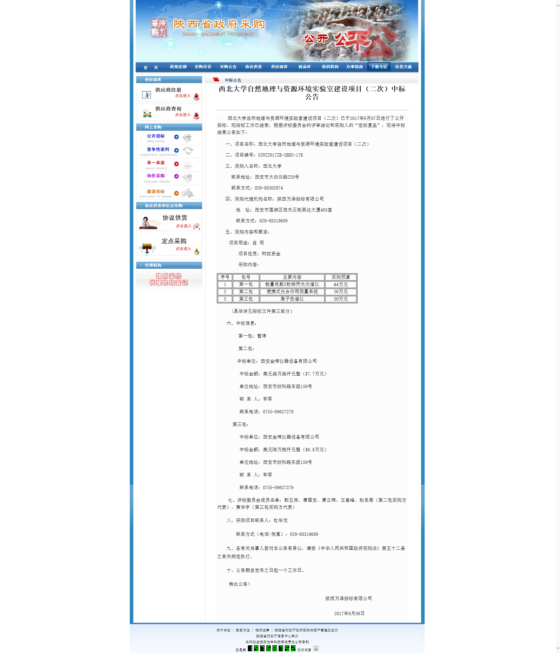 星空app官网自然地理与资源环境实验室建设项目(二次)中标公告 作者: 编辑: 时间:2017-06-09 08:34 http://www.ccgp-shaanxi.gov.cn/zbxxs.jsp?NewsID=ZH170608102215US101028111214&ClassBID=C0002