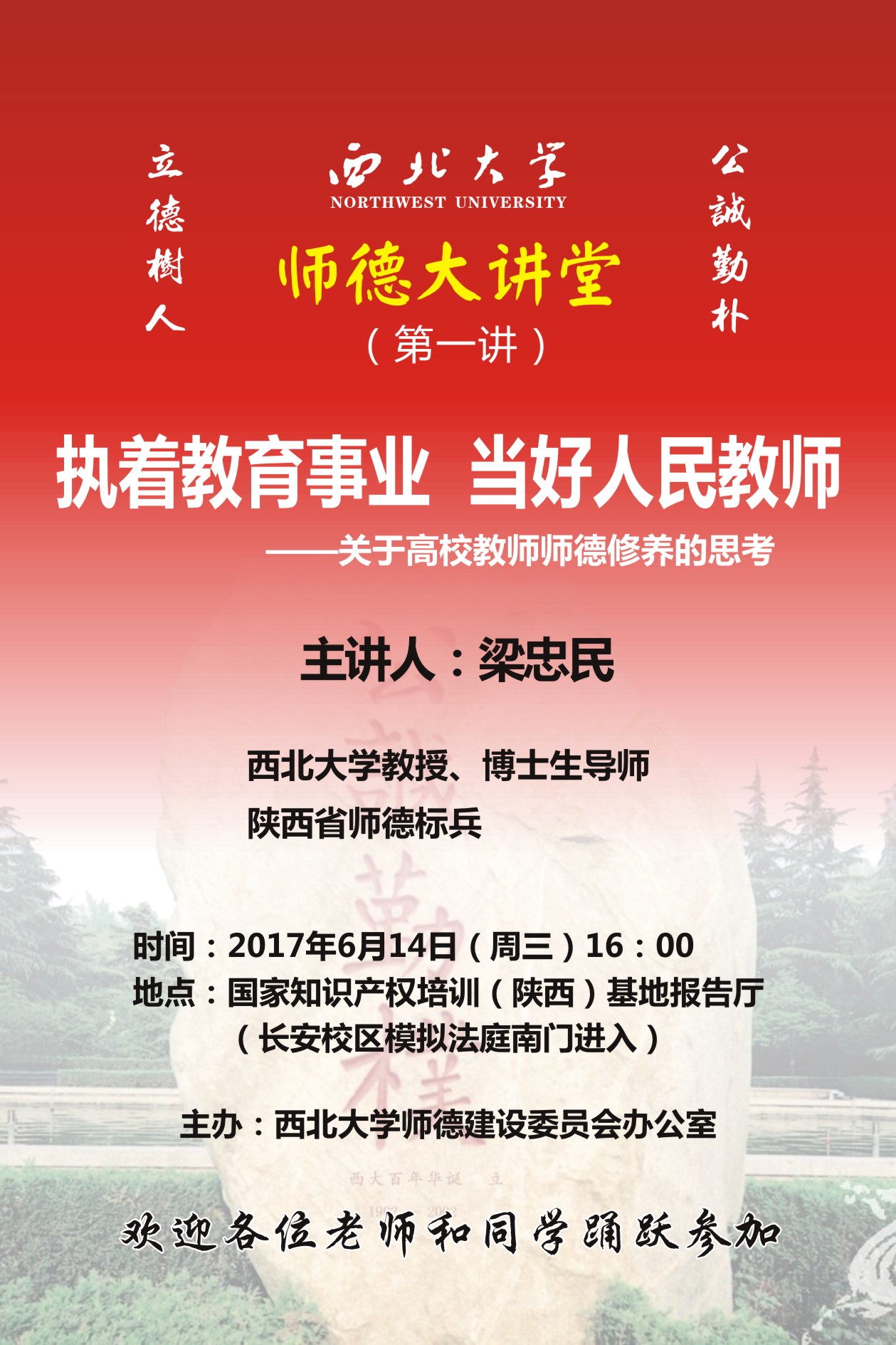 根据《中共星空app官网委员会星空app官网关于建立健全师德建设长效机制的实施意见》(西大党发[2015]21号),为全面贯彻落实教育部《关于关于建立健全高校师德建设长效机制的意见》精神,加强师德宣传,充分发挥师德典型的示范、引领作用,激励广大教师立足一线、爱岗敬业、无私奉献,推进立德树人工作。现将星空app官网“师德大讲堂”讲座有关事项通知如下: