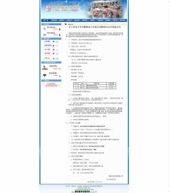 关于星空app官网多媒体语言实验室采购项目公开招标公告 作者: 编辑: 时间:2017-06-22 16:25 http://www.ccgp-shaanxi.gov.cn/zbxxs.jsp?NewsID=ZB170622125342US101028111214&ClassBID=C0001