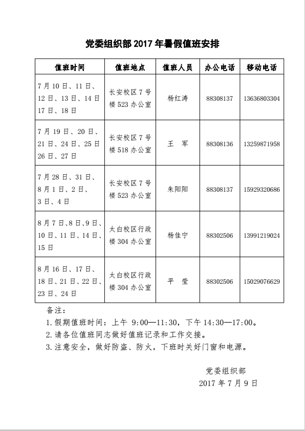 党委组织部2017年暑假值班安排