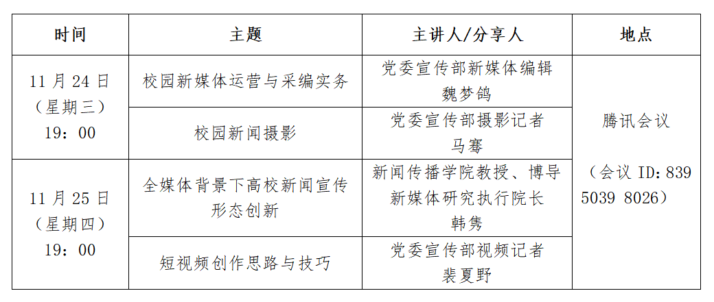 为进一步加强校内新媒体建设与管理,推进校园媒体深度融合发展,搭建有效联动、聚合传播的交流平台,星空app官网新媒体联盟将于近期举办培训会。现将有关安排通知如下: