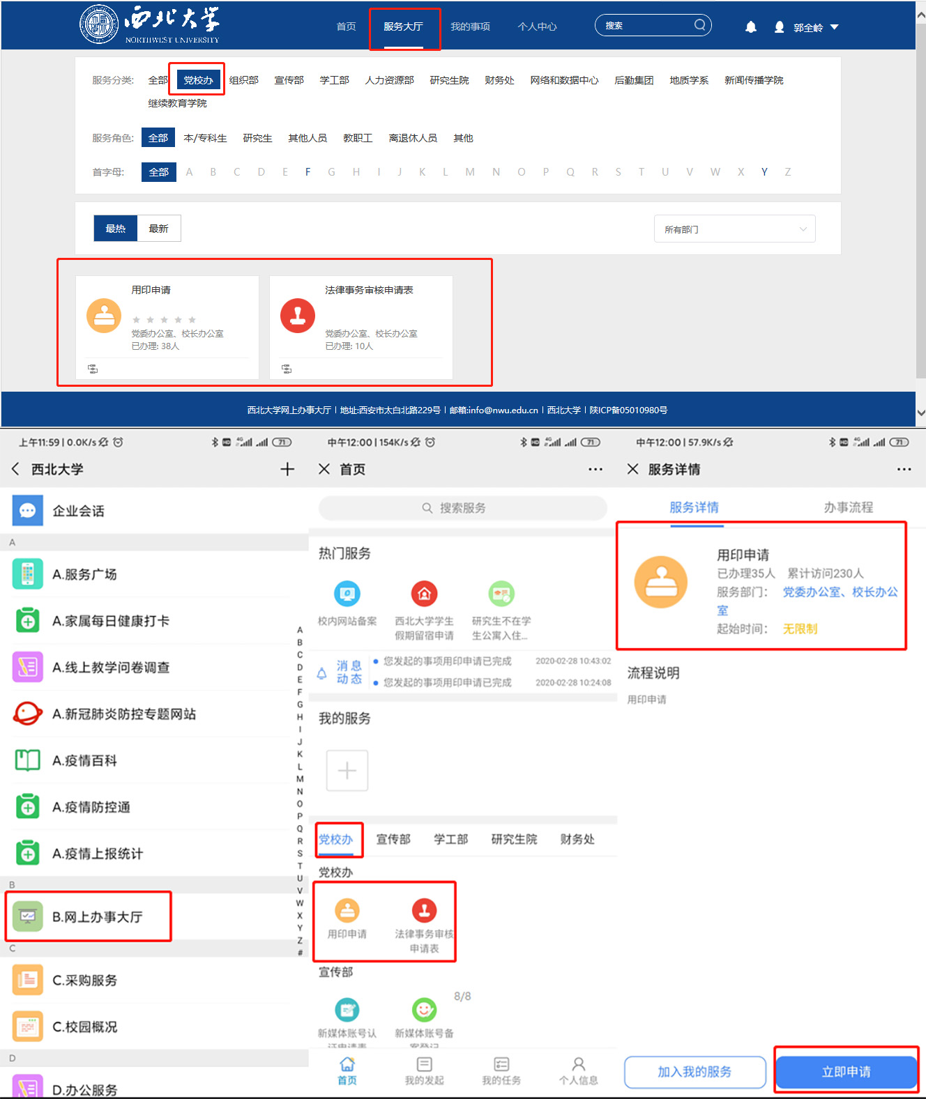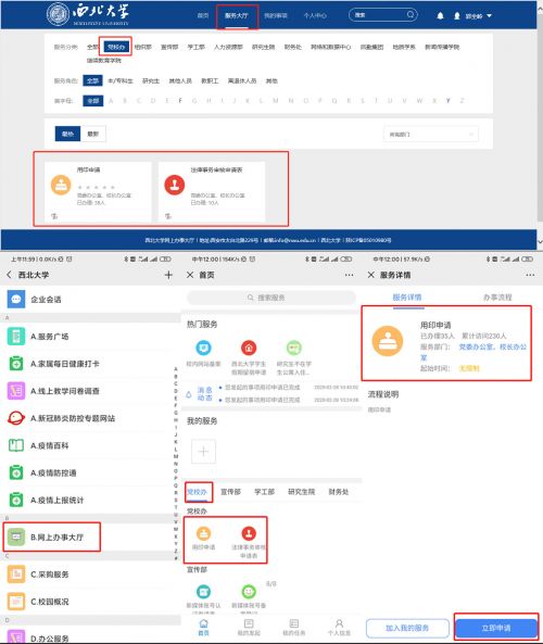 为保证疫情防控期间各项服务保障工作有序开展,进一步提高办事效率和服务质量,结合日常办公需求,党委办公室、校长办公室将于3月2日起启用线上用印申请、法律事务审核、会议组织和信访工作等信息化服务平台。具体流程如下:
