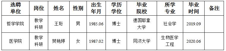 经用人单位及教学督导考核、学校研究,拟同意选聘下列人员来校工作,其聘任关系为A类人事代理。本着公平、公正、公开的原则,现将拟选聘人员基本情况公示如下: